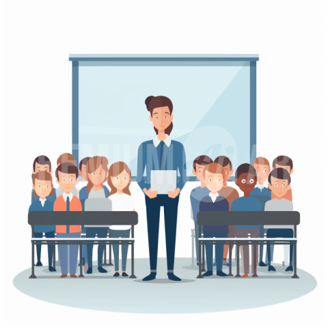 An illustration of a female teacher in a classroom with students.