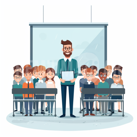 An illustration of a male teacher in a classroom with students.
