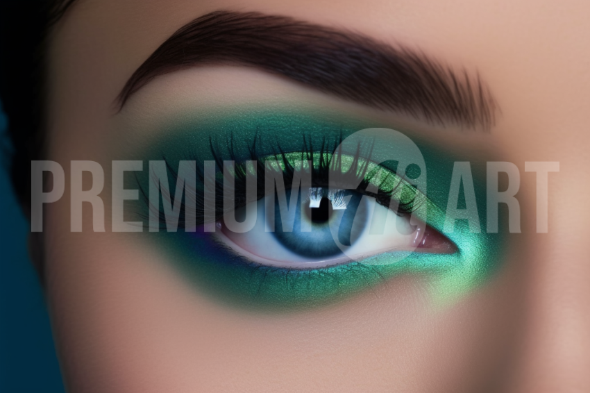 A close up photo of a blue eye with green eye shadow and a perfectly shaped eye brow.