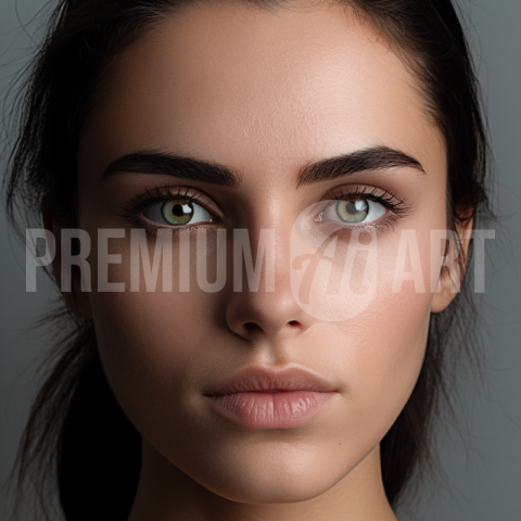A close up photo of a model with dark hair and hazel eyes.