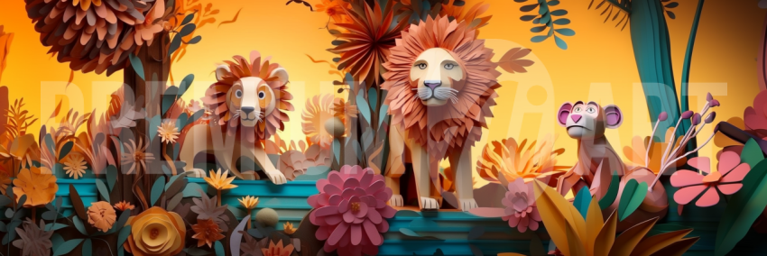 A whimsical jungle scene with lions and a monkey surrounded by flowers.