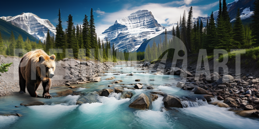 A natural Canadian landscape photo with brown bear and mountains in the background.