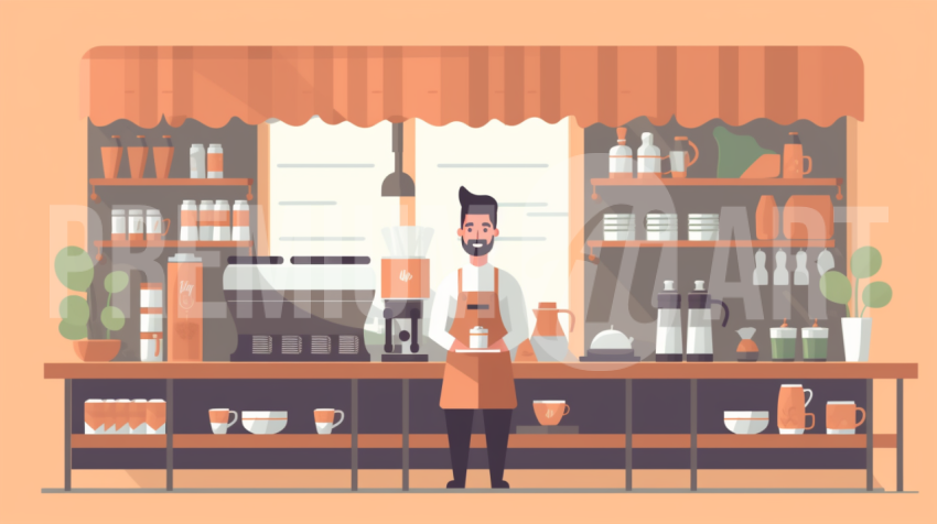 An illustration of a male barista standing in a cafe holding a cup of coffee.