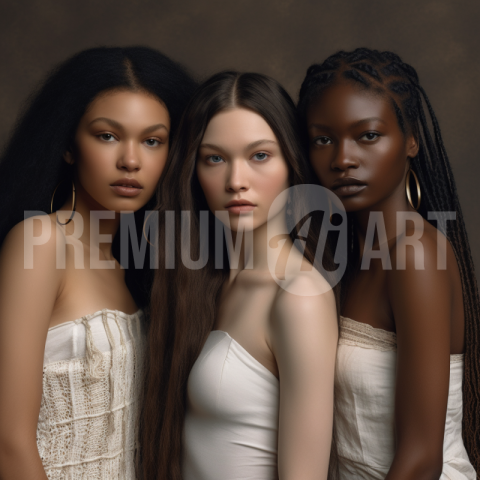 A close up photo of three women with long hair standing together