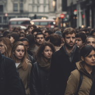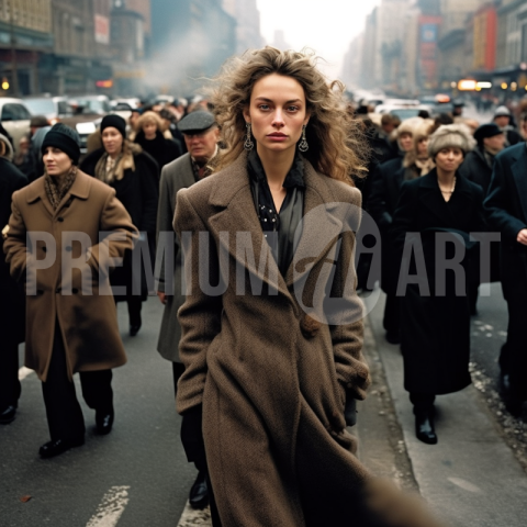 A woman wearing a long coat walking amongst a crowd of people on a cold winter day.