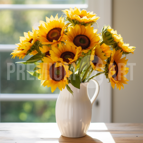 A bunch of Sunflowers in a white vase