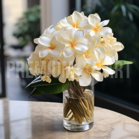 An elegant bunch of Frangipani flowers in a glass vase